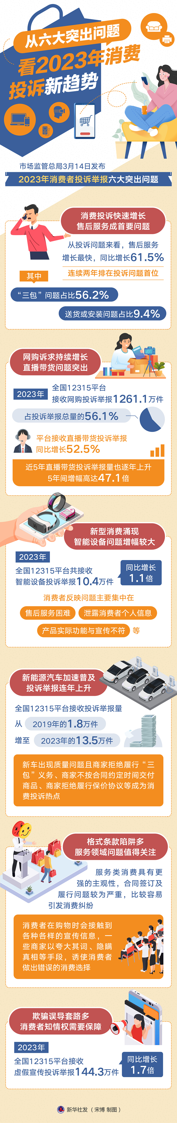 售后服务连续两年居投诉问题首位、直播带货投诉5年间增幅高达47.1倍、智能设备问题增幅较大、新能源汽车投诉举报连年上升、合同签订及履行问题纠纷较为严重、虚假宣传套路多……市场监管总局14日发布2023年消费者投诉举报六大突出问题。