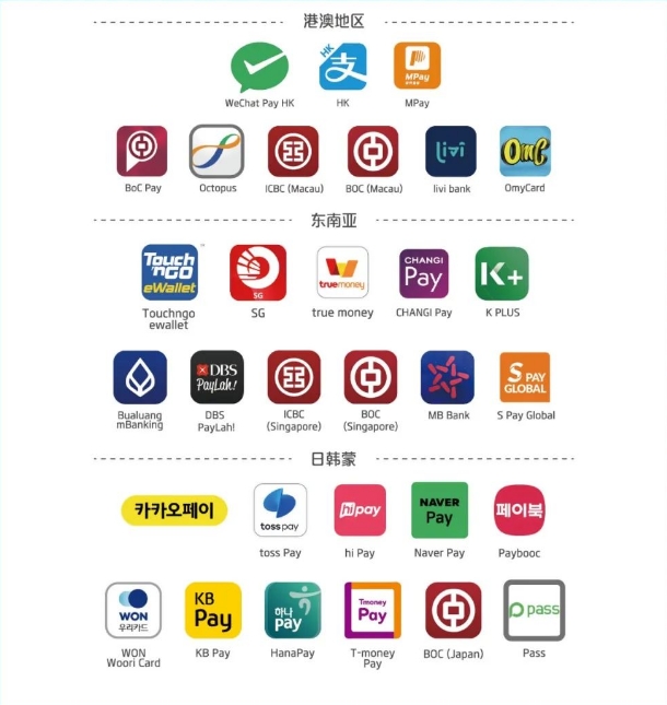 此外,部分境外电子钱包,可在境内商户通畅支付。以下境外电子钱包的用户,可直接使用现有钱包进行支付,无需另外下载其他App。