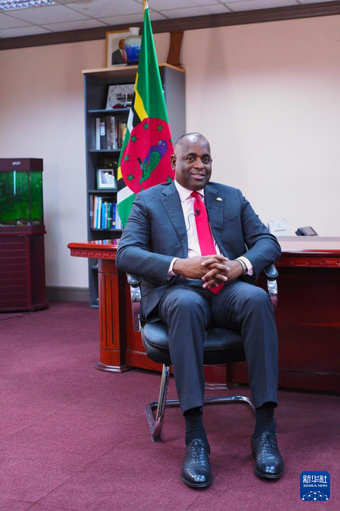 3月4日,多米尼克总理斯凯里特在首都罗索的总理办公室接受新华社记者独家专访。新华社记者 赵凯 摄