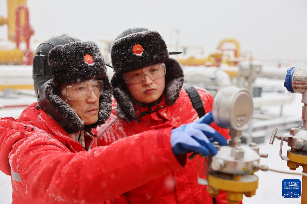 大港油田驴驹河储气库岗位员工查看压力表参数(2023年12月20日摄)。新华社发(大港油田供图)