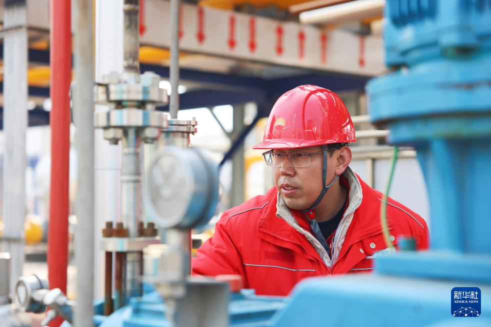 大港油田板南储气库运维工程师在生产装置区查看设备设施运行状态(2024年3月10日摄)。新华社发(大港油田供图)