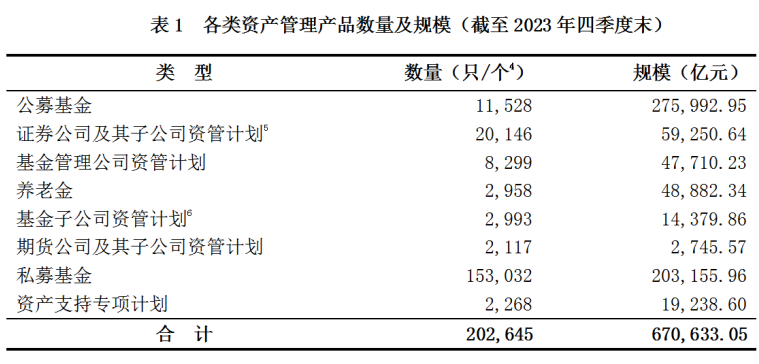 其中,公募基金规模27.6万亿元,证券公司及其子公司私募资产管理业务规模5.93万亿元,基金管理公司及其子公司私募资产管理业务规模6.21万亿元,基金公司管理的养老金规模4.89万亿元,期货公司及其子公司私募资产管理业务规模约2746亿元,私募基金规模20.32万亿元,资产支持专项计划规模1.92万亿元。(记者刘羽佳、刘慧)