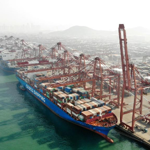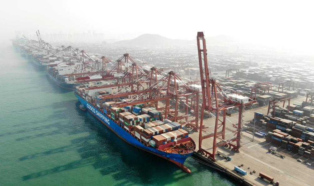 2月11日,货轮在青岛港集装箱码头装卸集装箱(无人机照片)。新华社记者 李紫恒 摄