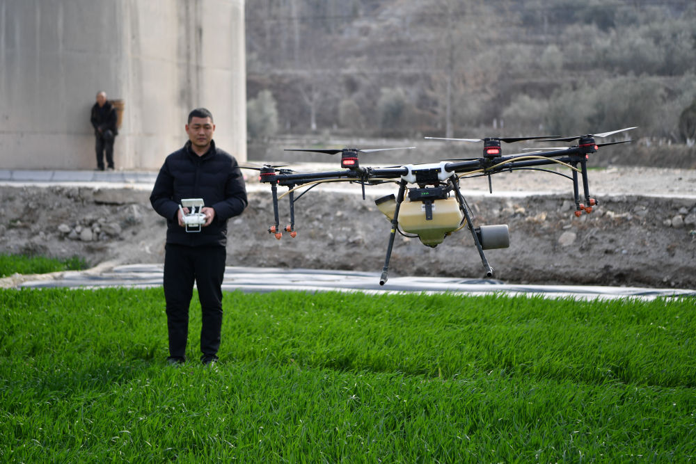 2024年3月9日,甘肃省陇南市武都区汉王镇农业技术推广站技术人员杨亮亮操作植保无人机给冬小麦施肥。新华社记者 陈斌 摄