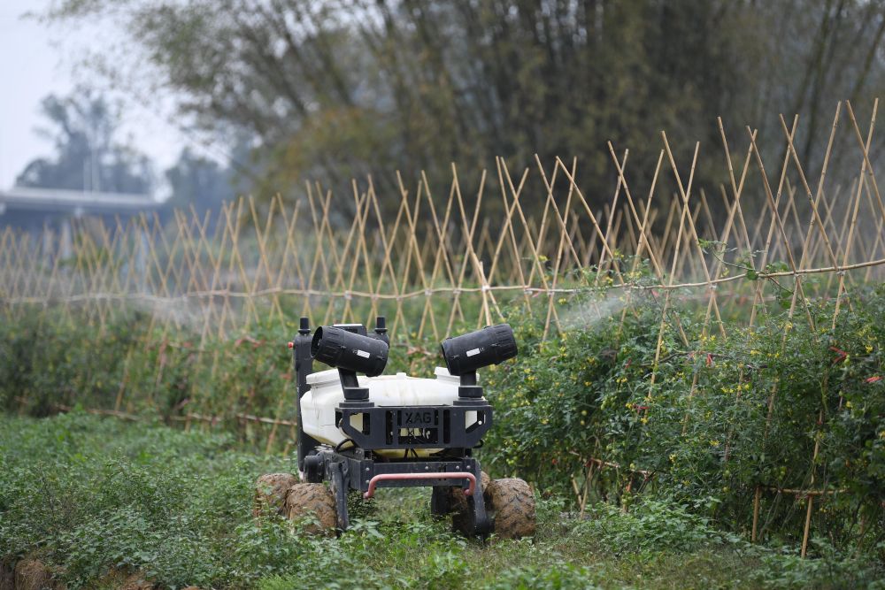在广州莲塘村举行的黄埔区春耕春播现场会上,一台自行走农机在进行喷洒作业(2024年3月15日摄)。新华社记者 邓华 摄