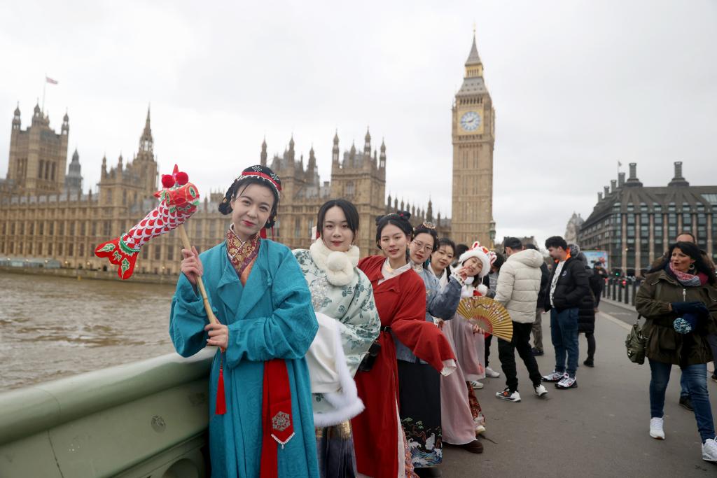 2024年2月25日,汉服爱好者在英国伦敦大本钟前展示汉服。新华社记者 李颖 摄