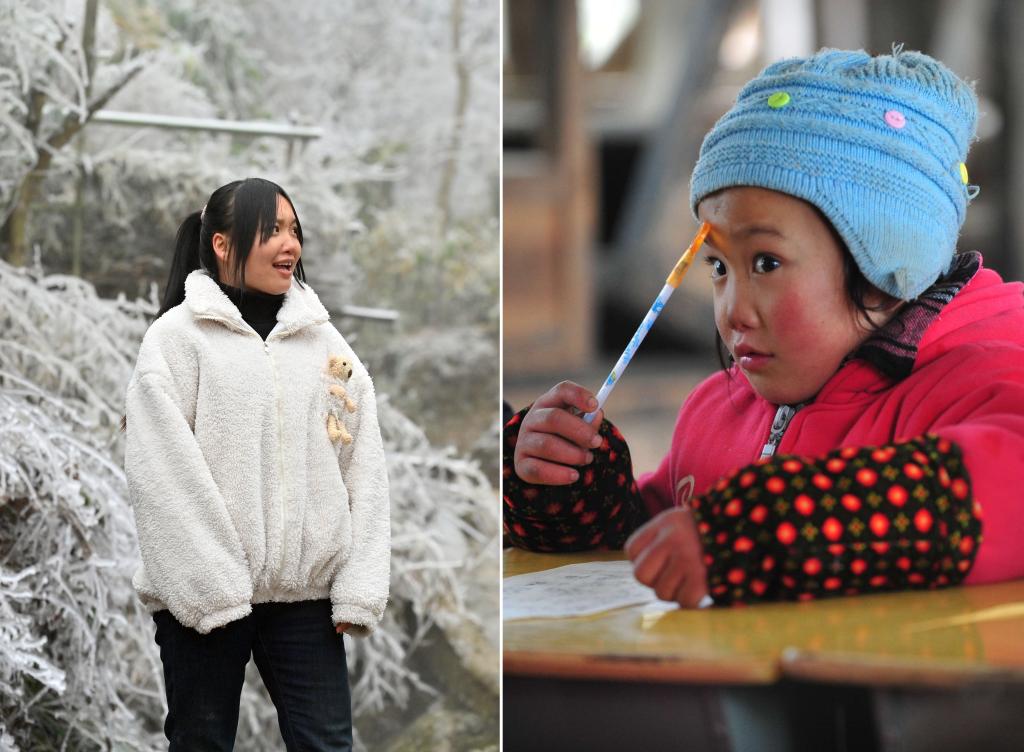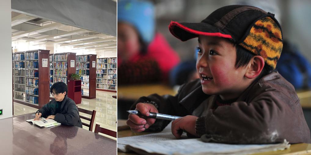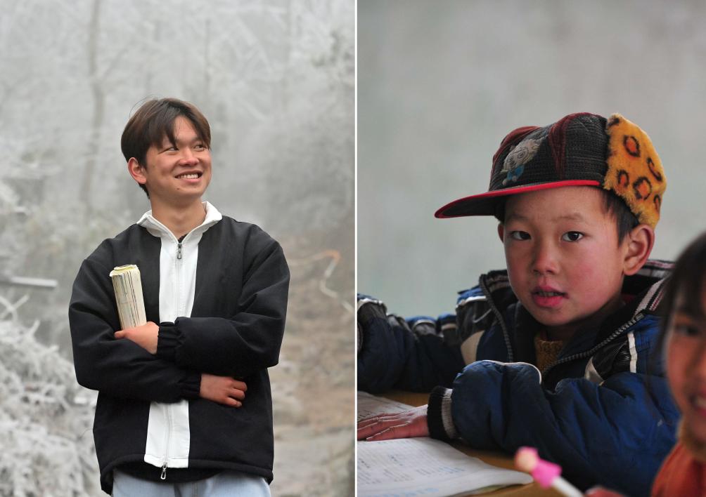 拼版照片:左图为21岁的梁玉锋在就读的西北民族大学图书馆前(2024年2月28日,史大全摄);右图为9岁的梁玉锋在大源小学教室里上课(2012年1月9日,新华社记者 黄孝邦 摄)。