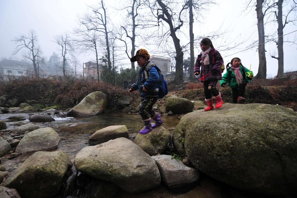 在桂林市全州县蕉江瑶族乡大源村,8岁的凤涛(左)和同学们走在放学回家的路上(2012年1月9日摄)。新华社记者 黄孝邦 摄