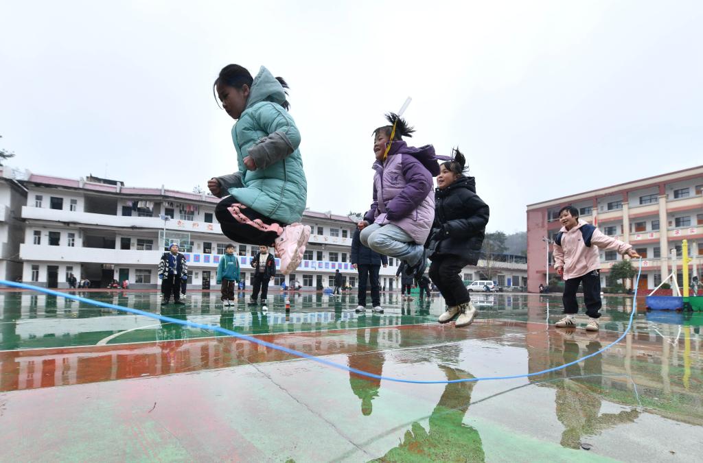 在桂林市全州县蕉江瑶族乡中心小学,大源村的孩子们在操场上玩耍(2024年2月28日摄)。新华社记者 黄孝邦 摄
