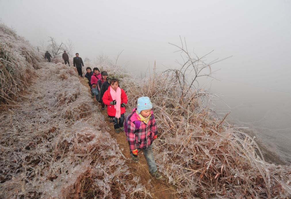 在桂林市全州县蕉江瑶族乡大源村,孩子们在老师和家长的护送下,走在放学回家的山路上(2011年1月10日摄)。新华社记者 黄孝邦 摄