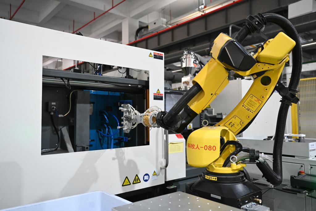 在福建泉州南安市九牧智能马桶“绿色黑灯灯塔工厂”,机械臂在流水线上作业。新华社记者 周义 摄