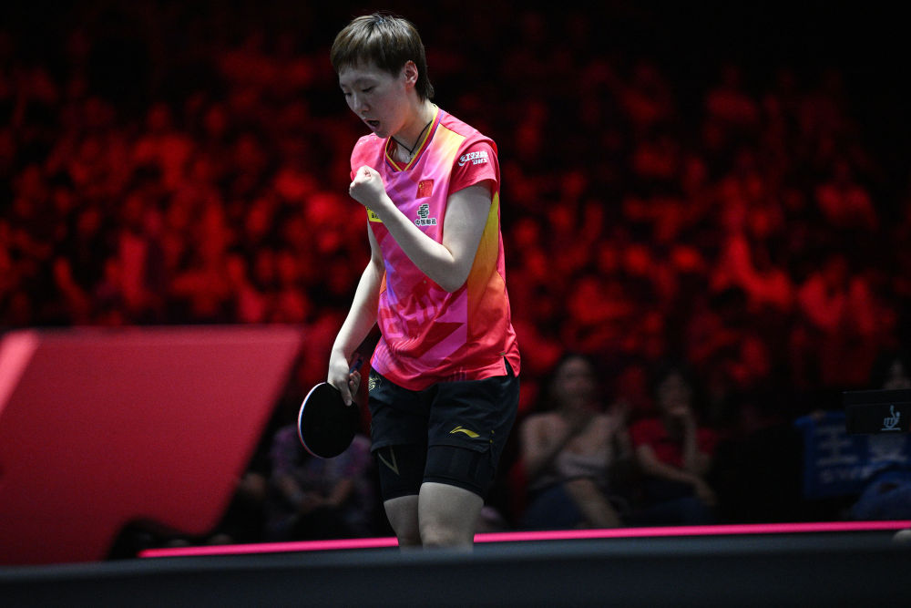 3月16日,王曼昱在比赛中庆祝。当日,她以4:1战胜队友陈梦,晋级决赛。新华社发(邓智炜 摄)