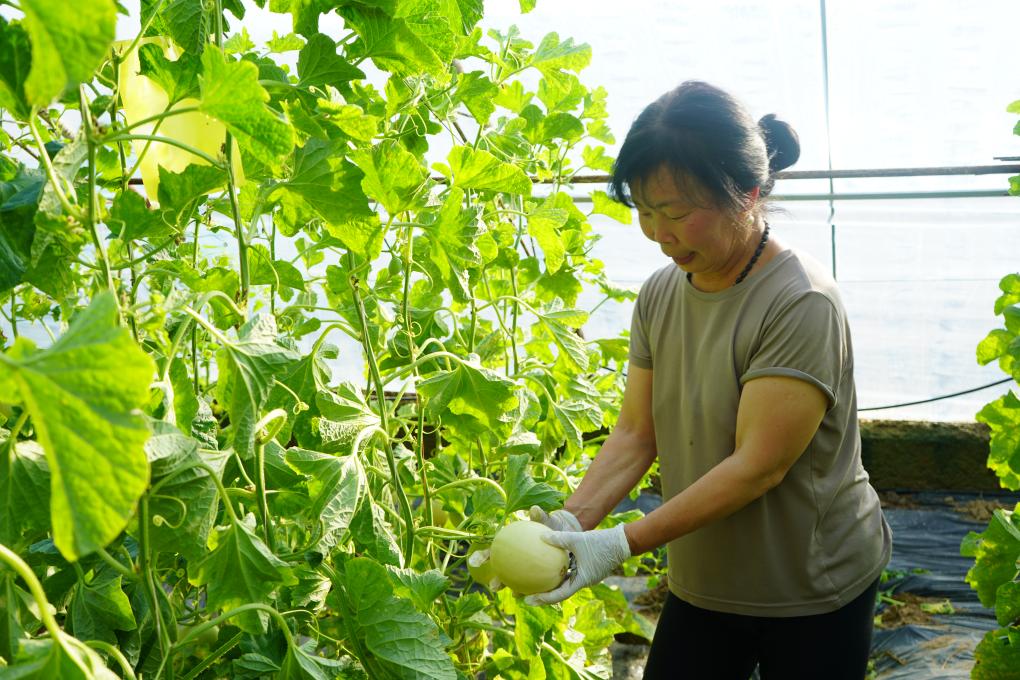 图为陕西省西安市阎良区关山街道北冯村农民正在查看即将收获的甜瓜。新华社记者刘彤 摄