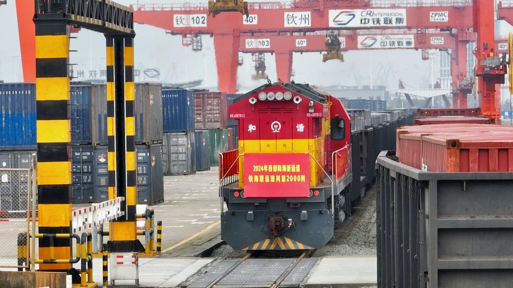 3月17日上午,一列满载缅甸黑芝麻、海南椰子汁、广西白糖等货物的海铁联运班列,从钦州铁路集装箱中心站缓缓发出驶向四川城厢站。这是2024年西部陆海新通道开行的第2000列海铁联运班列,同比增长16.8%,提前14天完成一季度班列开行任务。