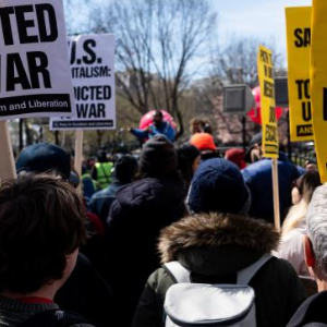 2023年3月18日,在美国首都华盛顿,反战人士在白宫前参加集会。 新华社记者 刘杰 摄