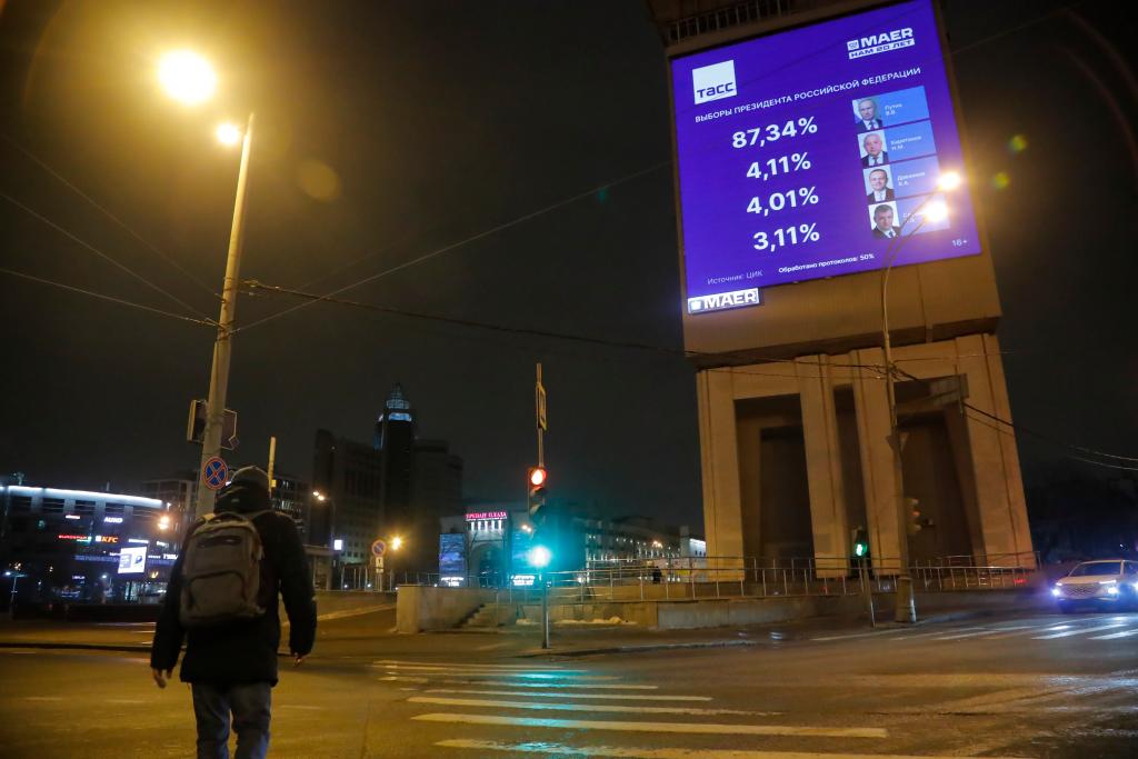 这是3月17日在俄罗斯首都莫斯科街头拍摄的屏幕上的总统选举实时统计数据。新华社发(亚历山大摄)