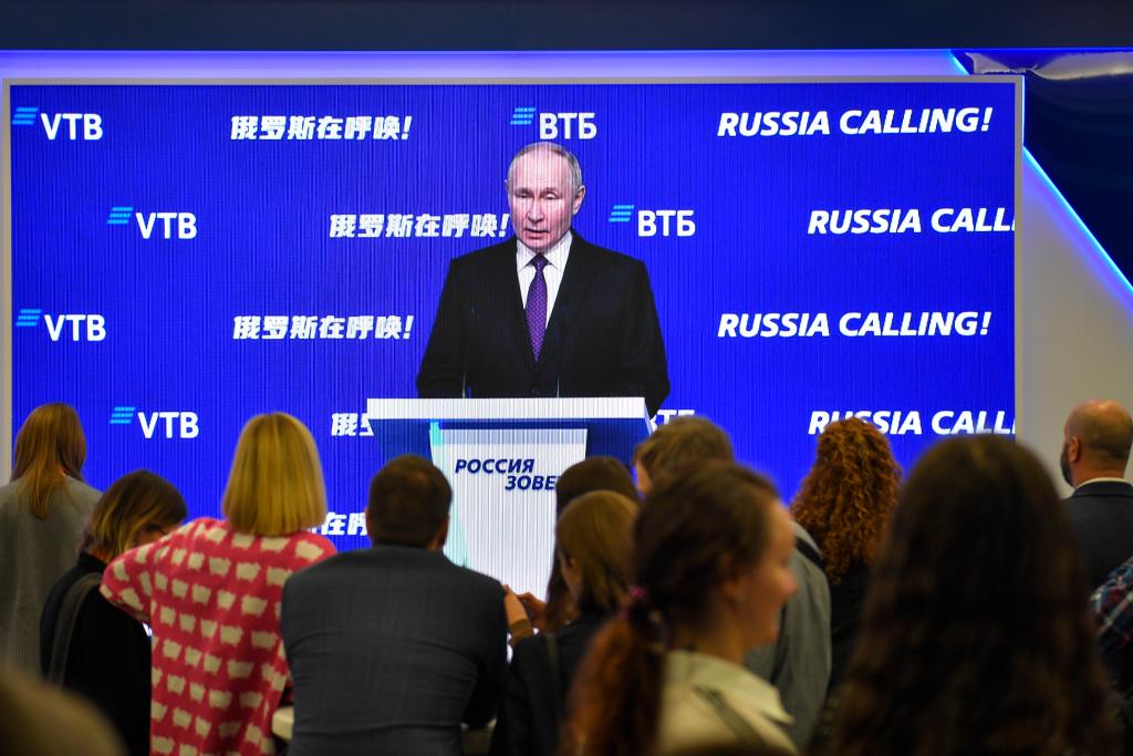 这是2023年12月7日拍摄的俄罗斯总统普京在莫斯科出席第十四届“俄罗斯在呼唤”论坛的视频画面。普京当日在论坛上表示,全球经济体系正在发生“根本性的、不可逆转的”变化,俄罗斯希望建立一种所有参与者真正公平竞争的世界经济发展模式。新华社发(亚历山大摄)