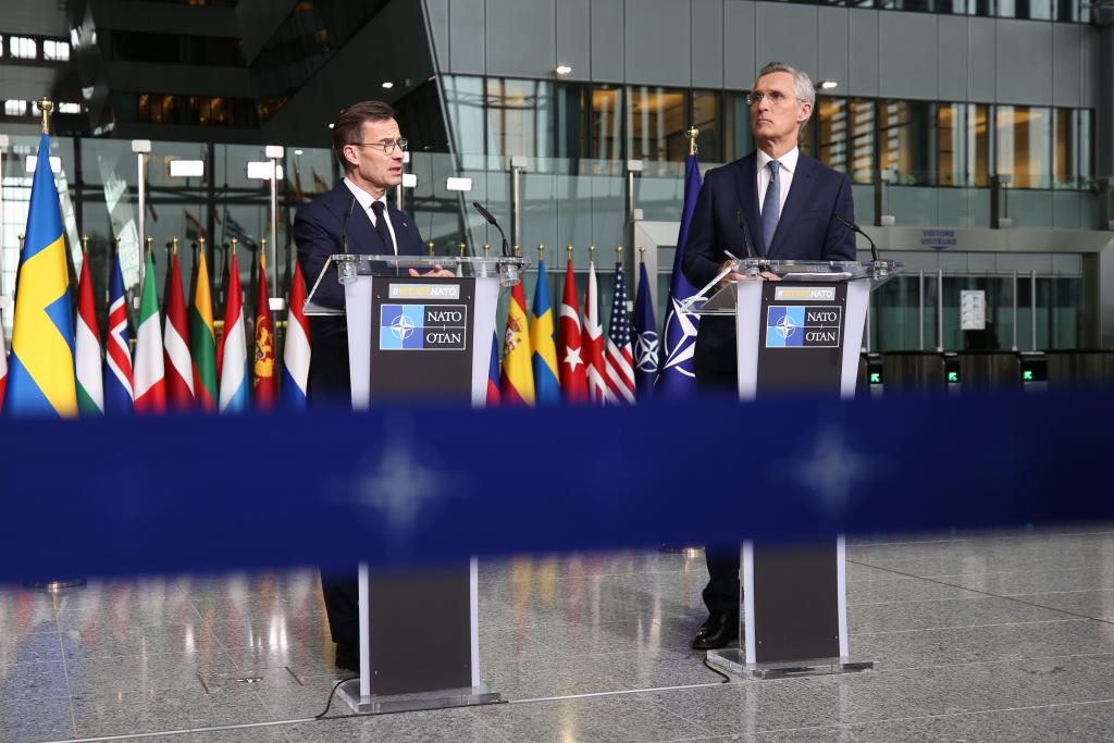 3月11日,在位于比利时布鲁塞尔的北约总部,瑞典首相克里斯特松(左)和北约秘书长斯托尔滕贝格出席联合新闻发布会。北约当日在其总部举行瑞典加入北约仪式。瑞典成为北约第32个成员国。新华社记者赵丁喆摄