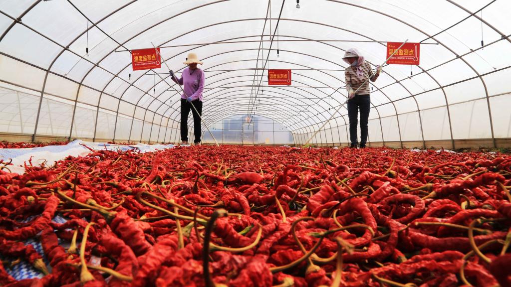 2021年9月19日,村民在甘肃省天水市甘谷县安远镇辣椒基地晾晒辣椒。新华社发(王克贤 摄)