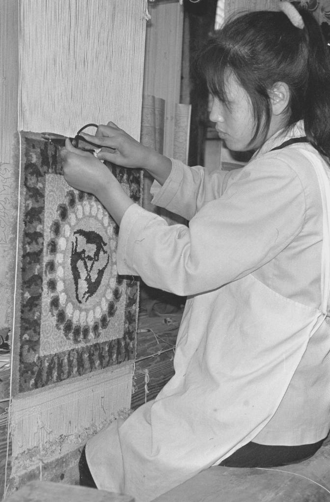 1992年,工作人员在手工制作天水丝毯。丝毯是以优质蚕丝为原料,经漂白、高温高压染色、手工编织、剪花等多道工序加工而成。新华社记者 王振山 摄