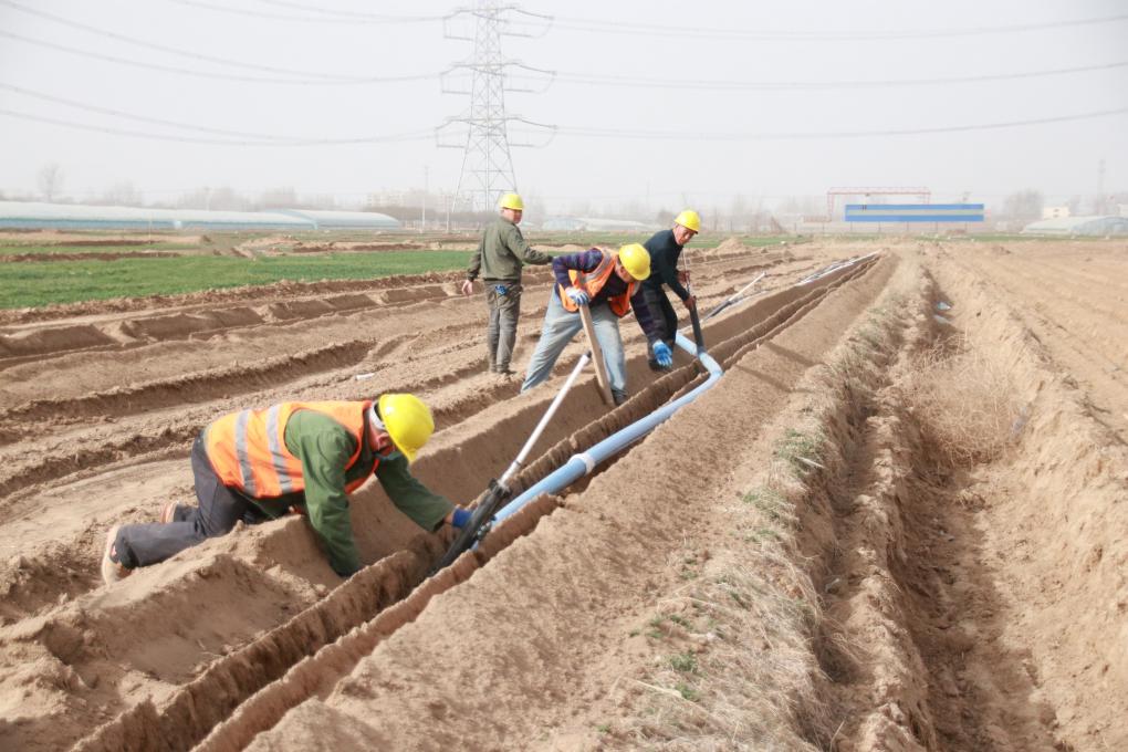 工人们在保定市蠡县小陈村的农田里铺设管网。新华社记者 王昆 摄