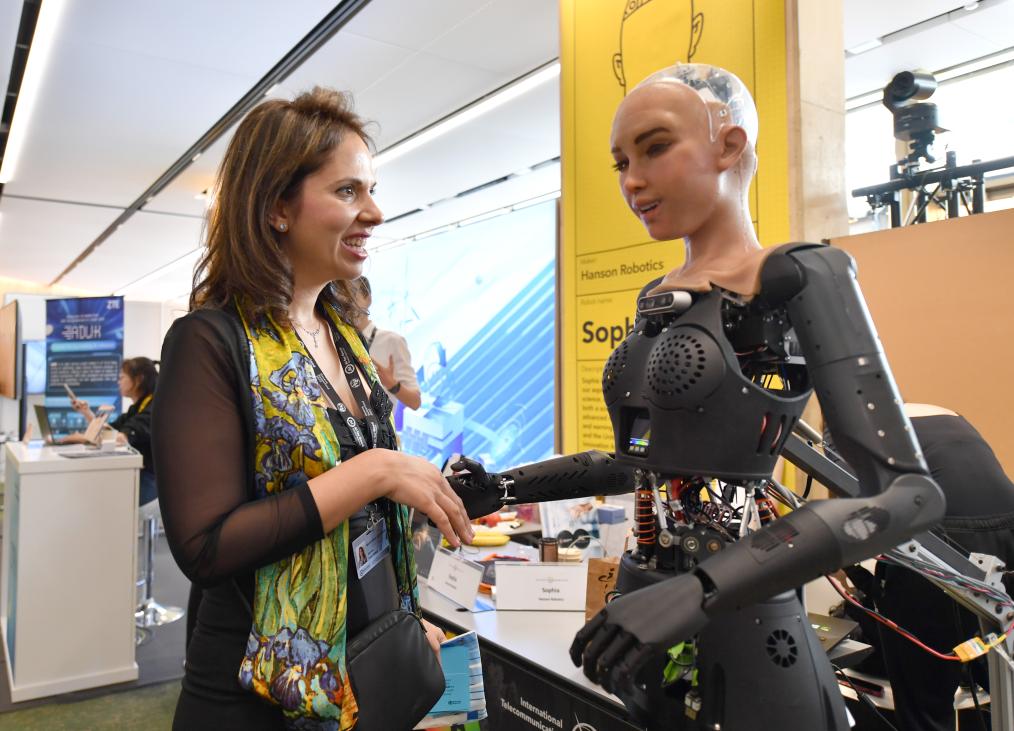 图为2023年7月7日,在瑞士日内瓦“人工智能造福人类全球峰会”上,一名参会者与仿真机器人索菲亚互动。新华社记者连漪摄