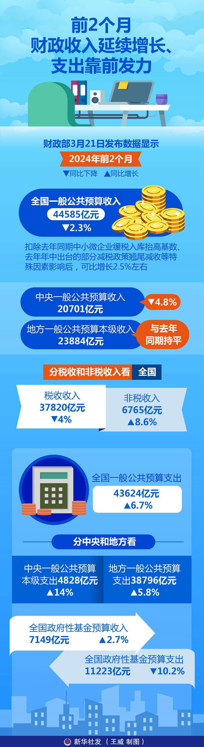 新华社北京3月21日电(记者申铖、严赋憬)财政部21日发布数据显示,今年前2个月,全国一般公共预算收入44585亿元,同比下降2.3%;扣除去年同期中小微企业缓税入库抬高基数、去年年中出台的部分减税政策翘尾减收等特殊因素影响后,可比增长2.5%左右。