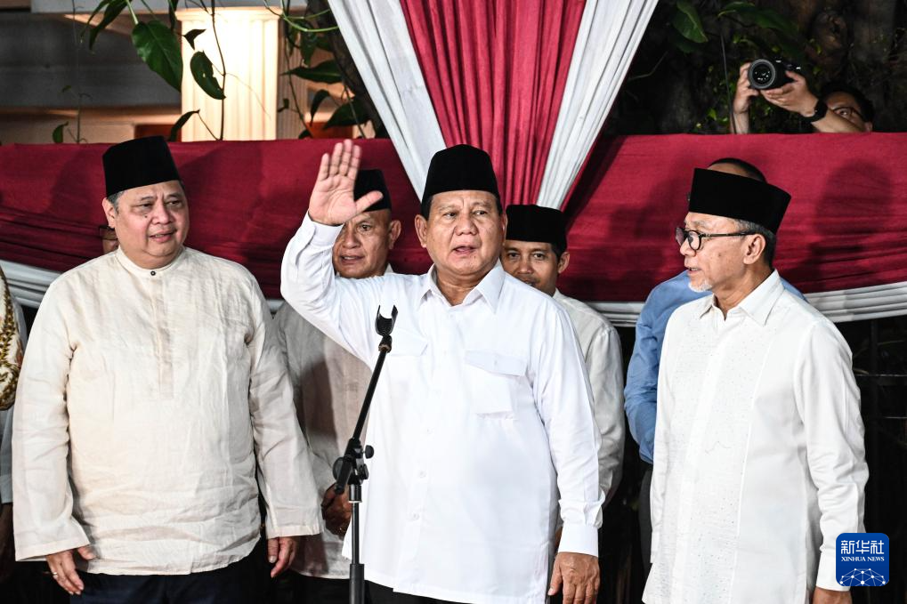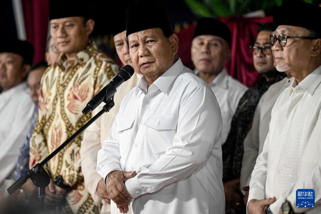 3月20日,在印度尼西亚雅加达,普拉博沃(中)在媒体记者和支持者到场的集会上讲话。新华社发(阿贡摄)
