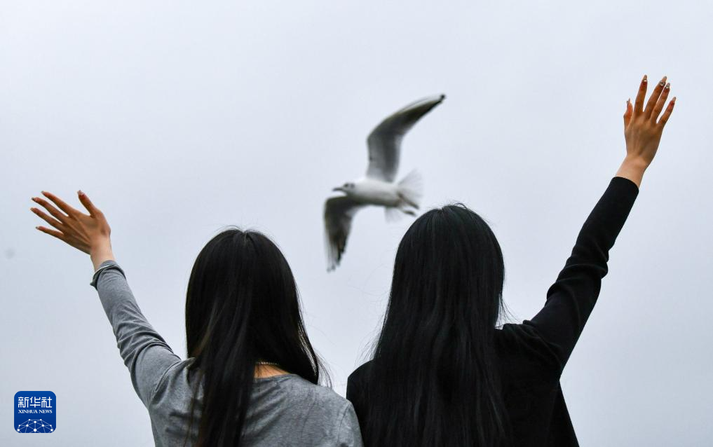 3月20日,游客在昆明海埂大坝向红嘴鸥告别。新华社记者 王静颐 摄