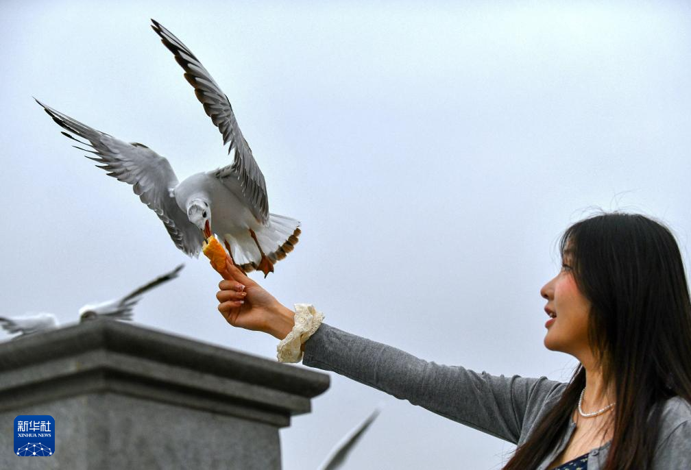3月20日,游客在昆明海埂大坝喂红嘴鸥。新华社记者 王静颐 摄