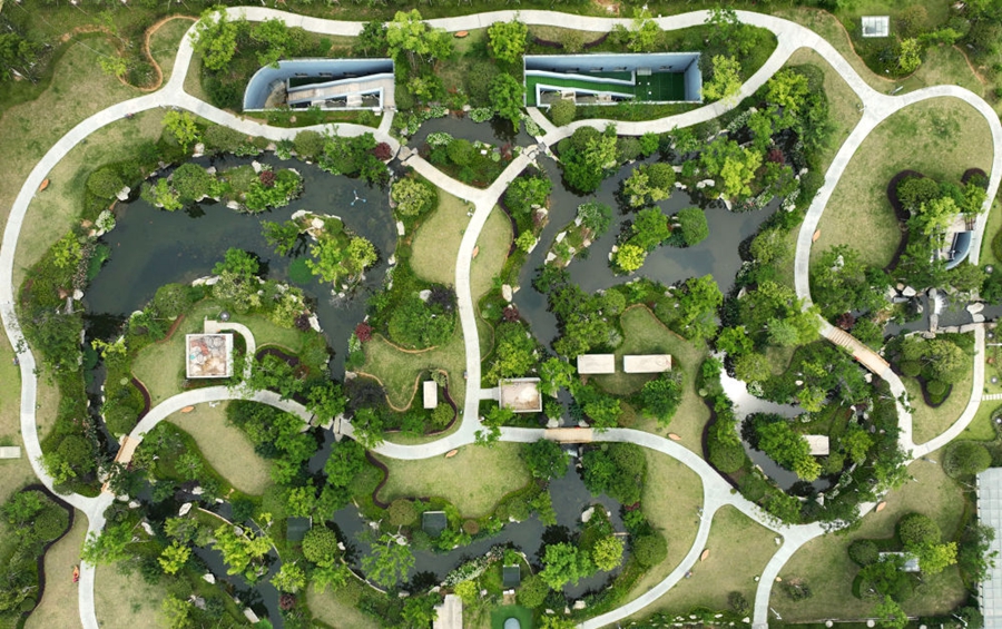 这是2023年6月15日拍摄的以“地上花园+地下治污”设计理念建设的九江市双溪公园(无人机照片)。近年来,江西省九江市启动中心城区水环境综合整治工程,通过地下污水治理、岸线生态修复、兴建“公园式”污水处理厂、城市智慧管网管控等措施,改善水环境,城市面貌焕然一新。