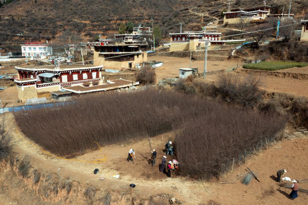 道孚县木茹乡古碉村的村民将培育好的根雀苗从地里移植出来,准备向其他乡村销售。新华社记者沈伯韩 摄