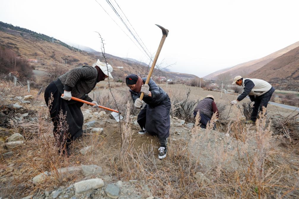道孚县麻孜乡德尔瓦村的村民在川西高原鲜水河畔的山上种植变叶海棠树苗。新华社记者沈伯韩 摄