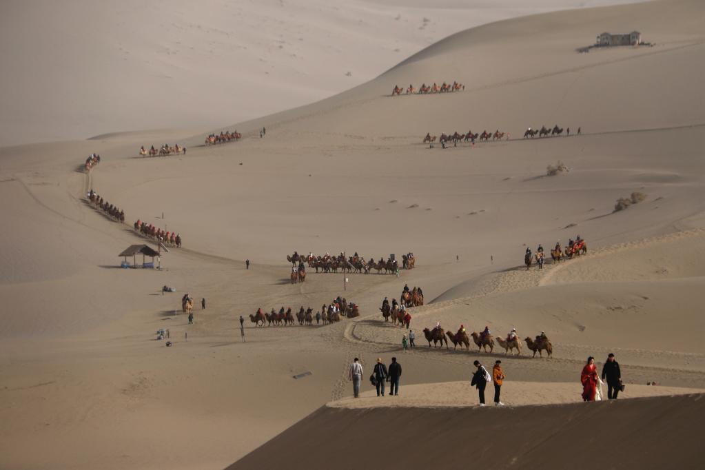 近日,记者走访河西走廊,发现古丝路沿线不少景区变得热闹起来,人流量增加明显,游人交谈中穿插着各地方言,敦煌鸣沙山月牙泉景区最受欢迎的骆驼乘骑项目甚至偶尔出现排队等待的情况。