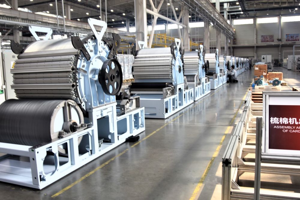 在卓郎新疆智能机械有限公司总装车间里,一台台梳棉机正待装配完成(2024年2月27日摄)。新华社记者 潘莹 摄