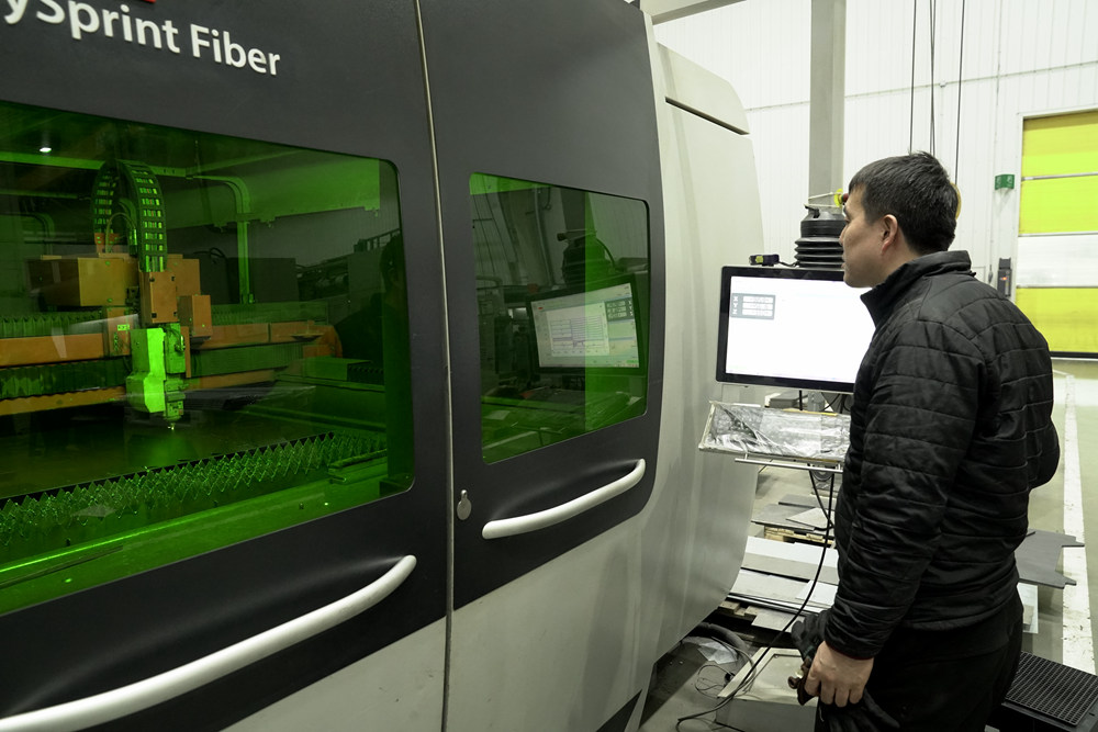 卓郎新疆智能机械有限公司工人操作激光切割机,根据零件形状对板材进行切割(2024年2月27日摄)。新华社记者 白志强 摄