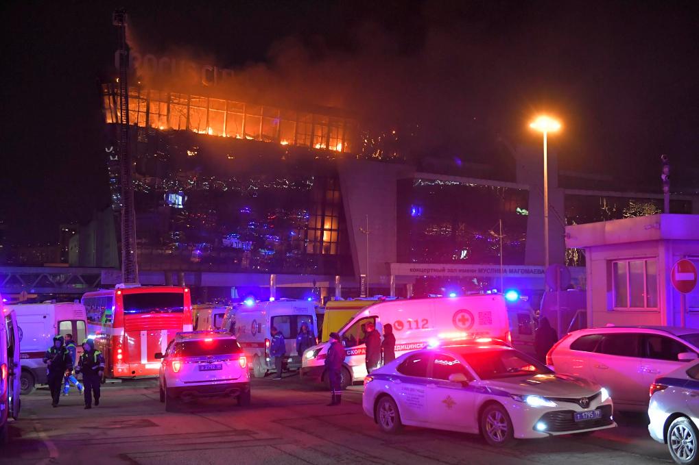3月22日,俄罗斯莫斯科近郊克拉斯诺戈尔斯克市一音乐厅发生枪击事件后引发火灾。新华社记者曹阳摄