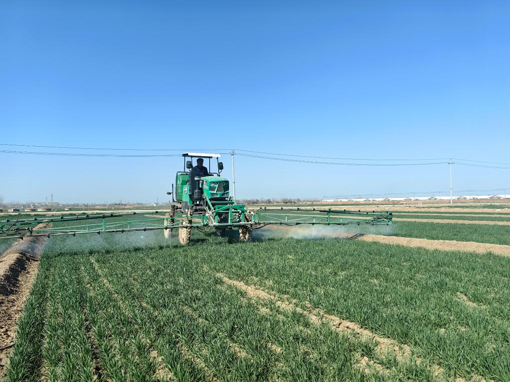 在阳谷县安乐镇于营新村,丰威农业服务有限公司工作人员正驾驶自走式喷杆喷雾机在麦田里喷洒除草剂。于营新村党总支书记武目林说:“过去村民得背着喷雾器打药,一天最多干10亩地的活。现在一台机器一天可喷洒400至500亩地,效率提升的同时还避免了漏喷、重喷等情况。”
