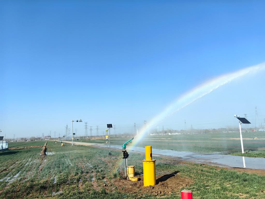 在山东省聊城市阳谷县石佛镇廉庄新村,出水桩喷出的渠水在麦田上划出的抛物线,“架”起一道道彩虹。正值春日好时光,麦子忙着“喝个水饱”,工作人员在一旁用手机App查看浇灌进程、调整出水量。
