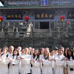 3月22日,美国华盛顿州中学生代表团抵达湖北十堰武当山。学生们身着练功服,徒步登上始建于元代的南岩宫,参观玄帝殿、天乙真庆宫。