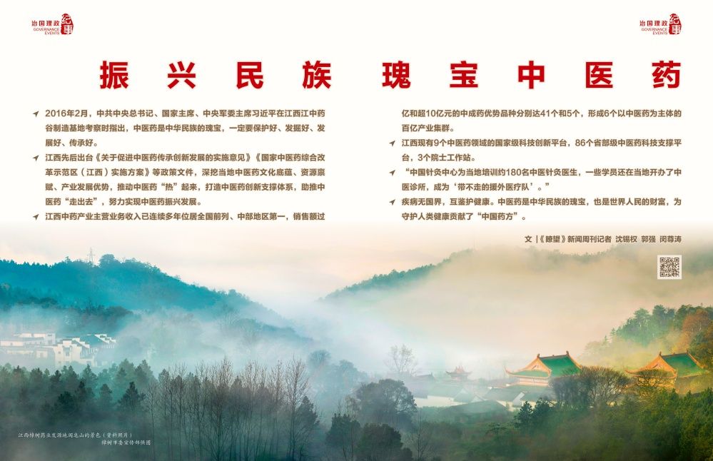 沿着习近平总书记指引的方向,江西先后出台《关于促进中医药传承创新发展的实施意见》《国家中医药综合改革示范区(江西)实施方案》《江西省打造中医药治未病传承创新发展新高地实施方案》等政策文件,深挖当地中医药文化底蕴、资源禀赋、产业发展优势,推动中医药“热”起来,打造中医药创新支撑体系,助推中医药“走出去”,努力实现中医药振兴发展。