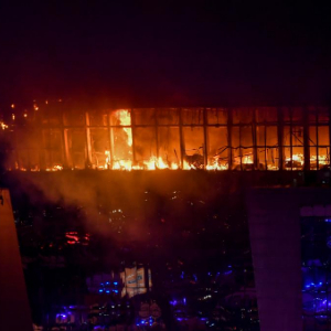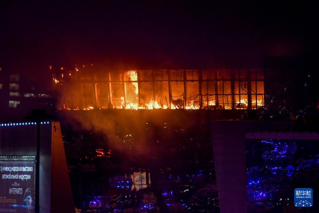 3月22日,俄罗斯莫斯科近郊克拉斯诺戈尔斯克市一音乐厅发生枪击事件后引发火灾。新华社记者 曹阳 摄