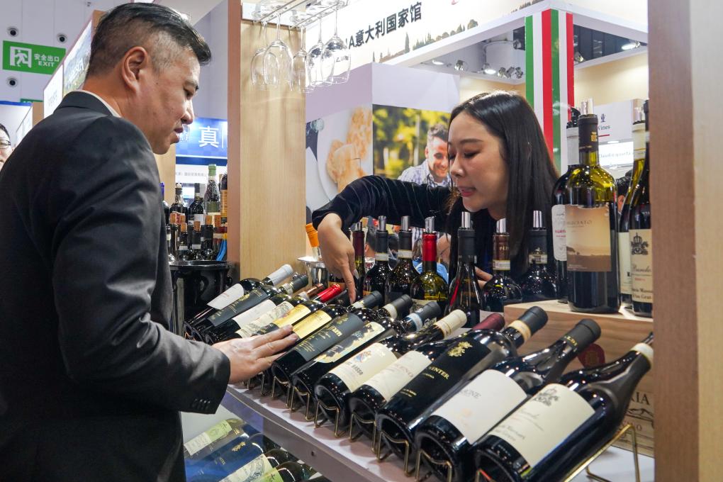 在第110届全国糖酒商品交易会上,参展商向客户介绍进口红酒。新华社记者 唐文豪摄