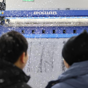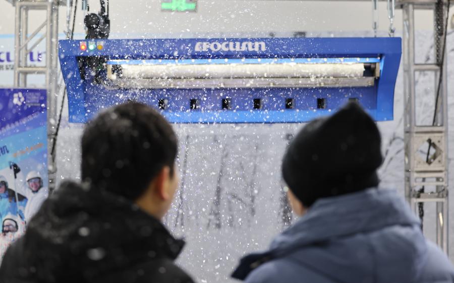 2023年12月16日,市民在首届呼伦贝尔·海拉尔冰雪产品冬季展销会上观看飘雪机工作。新华社记者 王楷焱 摄
