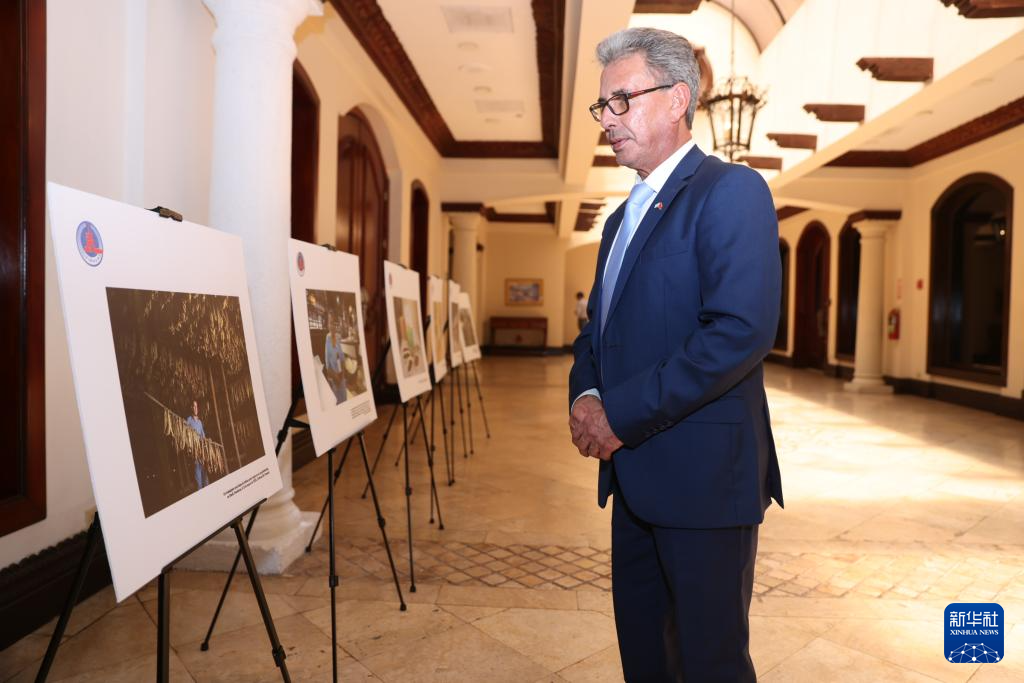 3月22日,在洪都拉斯特古西加尔巴,洪都拉斯第三副总统雷纳托·弗洛伦蒂诺观看“中洪建交一周年新华社稿件展”。新华社记者 李梦馨 摄