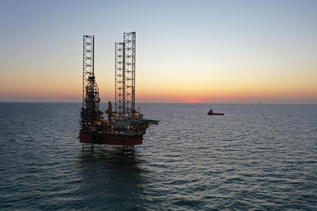 “海洋石油946”钻井平台正在渤海进行深层油气钻探作业。(中国海油供图)