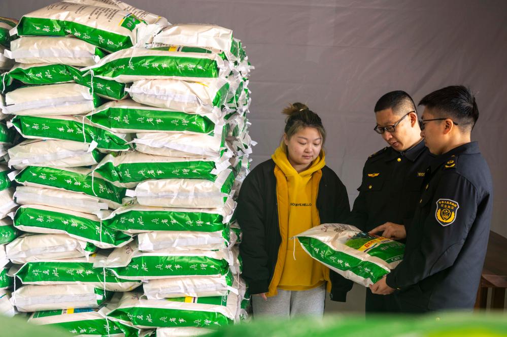 3月13日,江苏省泰州市姜堰区农业执法大队执法人员对顾高镇一家农资经营网点库存化肥进行检查。新华社发(汤德宏摄)