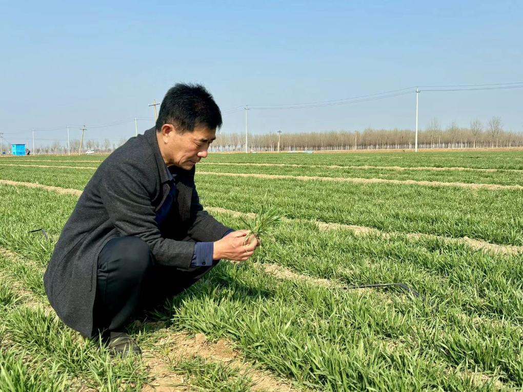人勤春早,鲁西南的田野里生机勃勃。在山东省济宁市汶上县南站街道大街村,种粮大户徐西俊走在田垄边,不时俯身查看苗情。“前两天刚浇了返青水,麦子长势比去年好多了。”