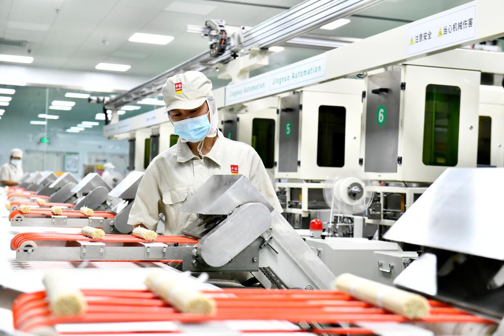 在滨州中裕食品有限公司挂面生产车间,工作人员在流水线上值守。新华社记者郭绪雷 摄