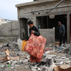 3月26日,在加沙地带南部城市拉法,人们在废墟中收集物品。新华社发(哈立德·奥马尔摄)